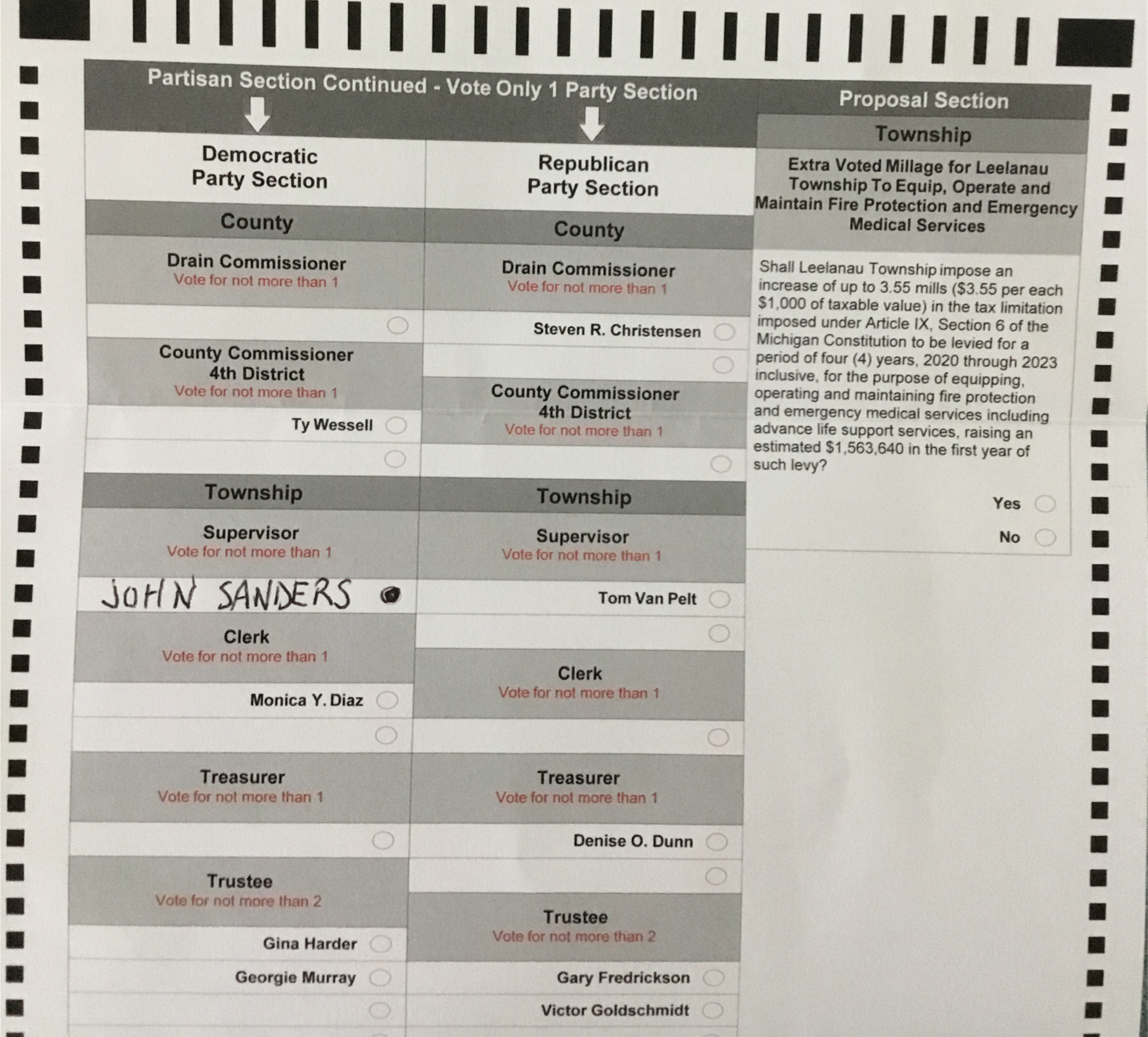 Important points, in order for the “write ins” to count – one must (see image below):Write John Sanders in the Democratic Party Section of their Ballot in the space provided under Township, Supervisor.Write John Sanders in an easily legible form.Fill in the circle next to his name.If you vote ” Straight Party” you would still need to write in John Sanders There is a threshold of votes that John will need to qualify for the nomination and appear on the November ballot so we need all Leelanau Township Democrats to vote in the primary and to write in John Sanders in the Democratic section of their ballots, under Township- Supervisor, in a legible manner, and fill in the circle next to his name!